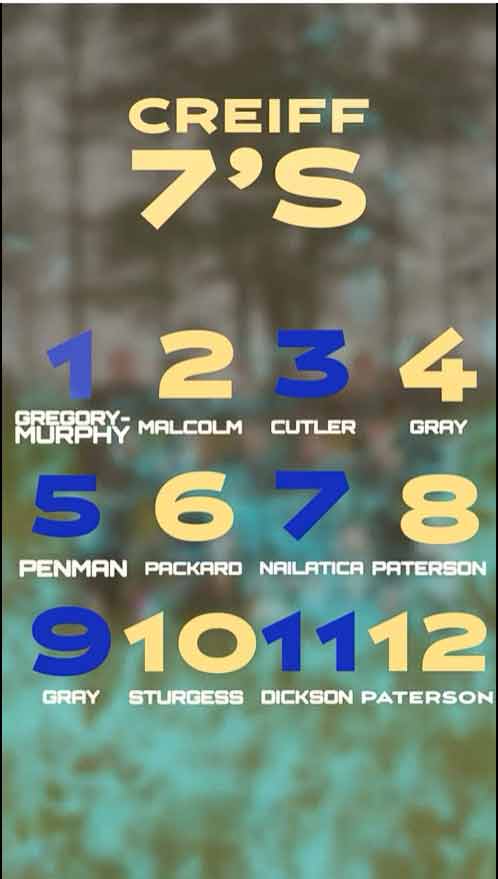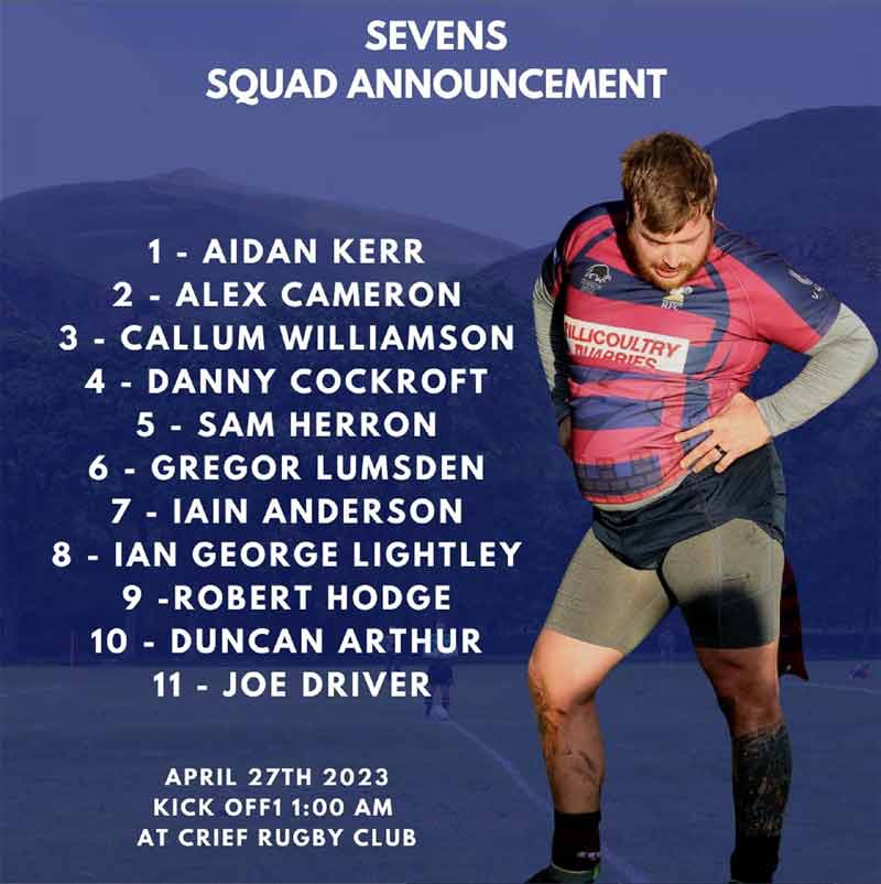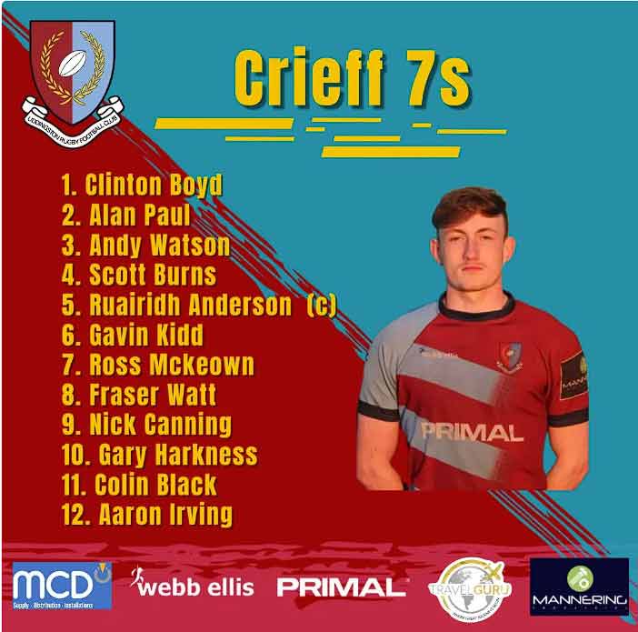 Crieff’s annual sevens competition takes place tomorrow, and competing will be Perthshire, Kinross, Hillfoots, Blairgowrie, Paisley and Dunfermline. Crieff will be fielding two teams. A team—G. Drummond. D. Scobie. Davidson. J. Skea. M. Lyle. H Walker, J. Halley. B team—S Cramb, W. Drummond, N. Clark, R. Scott Miller, A. McNicol, R. Hunter, A. Donald